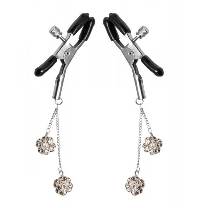 Сверкающий набор украшенных стразами зажимов для сосков не даст оторвать от вас взгляд! Украшения в форме куба обрамлены со всех сторон прозрачными сверкающими драгоценными камнями, которые ловят и отражают свет при каждом движении. Сами зажимы имеют виниловое покрытие и винт, который позволяет регулировать степень зажима по мере необходимости.