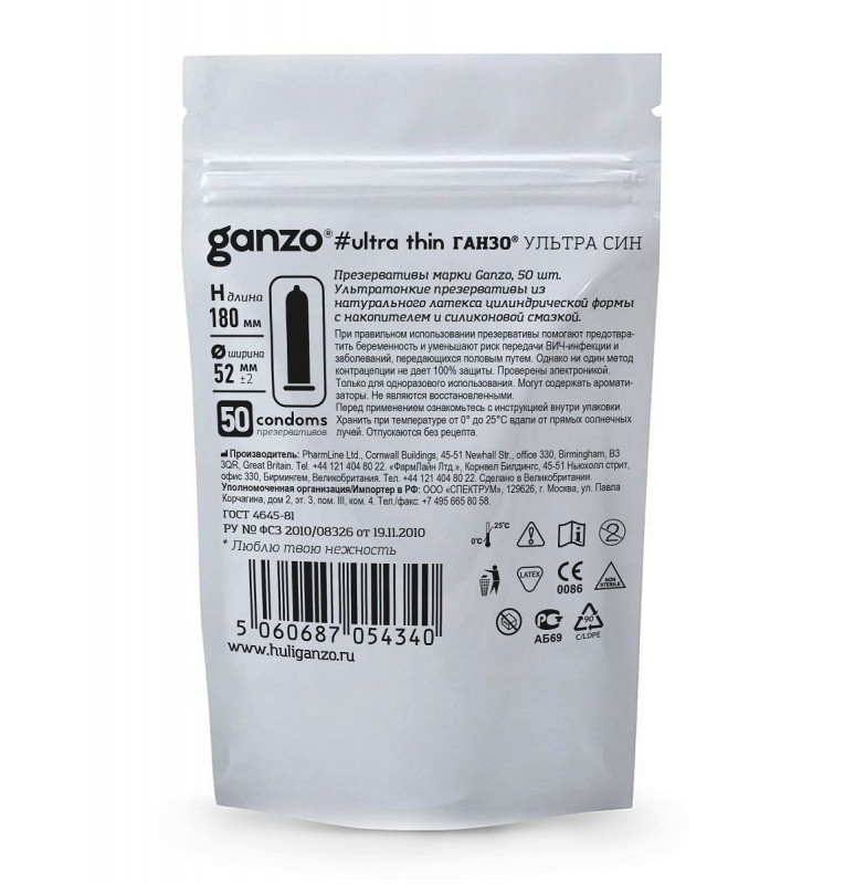 Прозрачные презервативы Ganzo Ultra thin цилиндрической формы с накопителем, силиконовой смазкой и супер тонкими стенками для более естественных ощущений. Изготовлены из натурального высококачественного латекса. Проверены с использованием электростатической технологии для большей надежности. Толщина стенки - 0,049 мм. Ширина - 52+/-2 мм. В упаковке - 50 шт.
