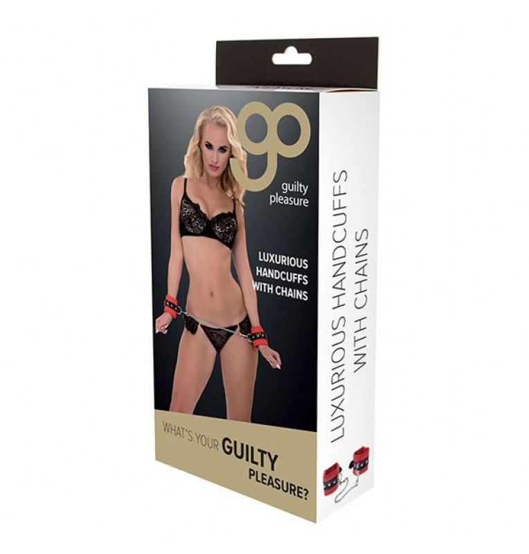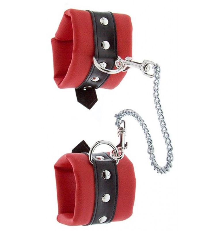 Красно-чёрные наручники HANDCUFFS WITH CHAINS на карабинах и металлической цепочке. Длина цепочки - 33 см.