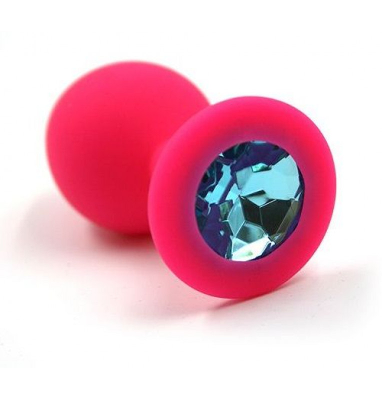 Анальная пробка из силикона розового цвета, размер M. Страз в основании круглой формы, выполнен из стекла голубого цвета. Упакована в вельветовый мешочек для хранения. Вес - 46,5 граммов.