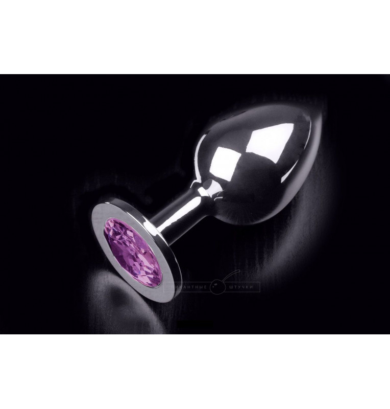 Большая серебристая анальная пробка с круглым кончиком и ярким фиолетовым кристаллом - 9 см.