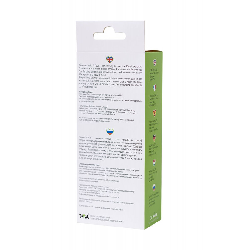 Вагинальные шарики A-Toys — это идеальный способ попрактиковать упражнения Кегеля. Маленькие ушки на вершине шарика усиливают удовольствие во время ношения. Удобный силиконовый шнур позволяет с легкостью вводить и извлекать игрушку. Водонепроницаемы и просты в уходе. Просто нанесите ваш любимый лубрикант и вставьте шарики один за другим. Рекомендуется использовать игрушку не более 2 часов, начиная с 20-30 минут ежедневно. Рабочая длина - 7,2 см. Вес - 65 гр.