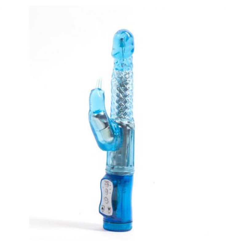 Голубой вибратор с двумя моторами и двухсторонней ротацией - 24,5 см.