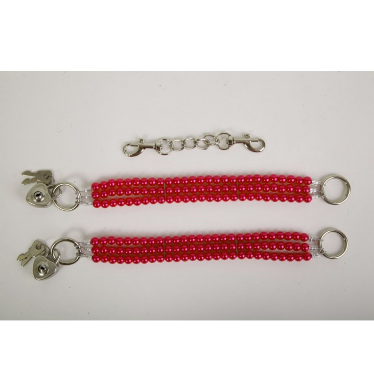 Красивые наножники из красного жемчуга с замочками в виде сердца и четырьмя ключиками. Чтобы ограничивать движения есть небольшая цепочка с двумя карабинами. Упаковка - картонная золотая коробка с бантиком. Длина соединительной цепочки - 13 см. Длина браслетов - 26 см., ширина - 2,5 см.