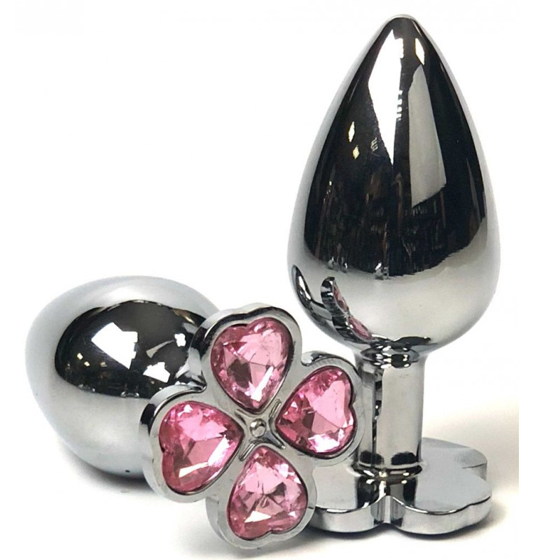 Серебристая анальная втулка с клевером из нежно-розовых кристаллов - 9 см.