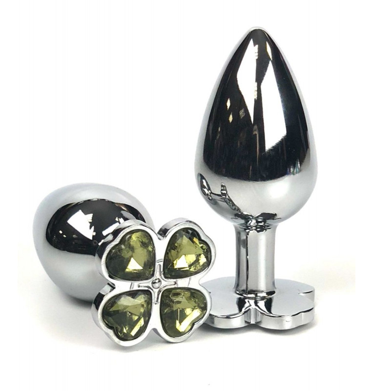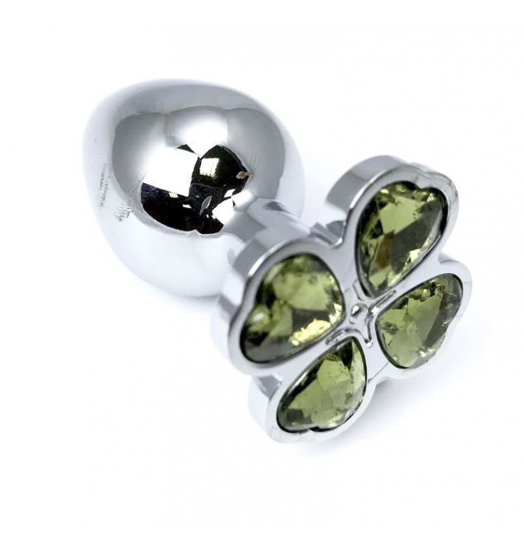 Серебристая анальная втулка с клевером из лаймовых кристаллов - 9 см.