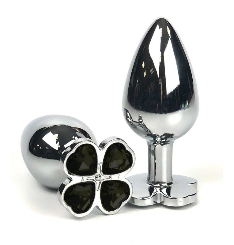 Серебристая анальная втулка с клевером из черных кристаллов - 8 см.