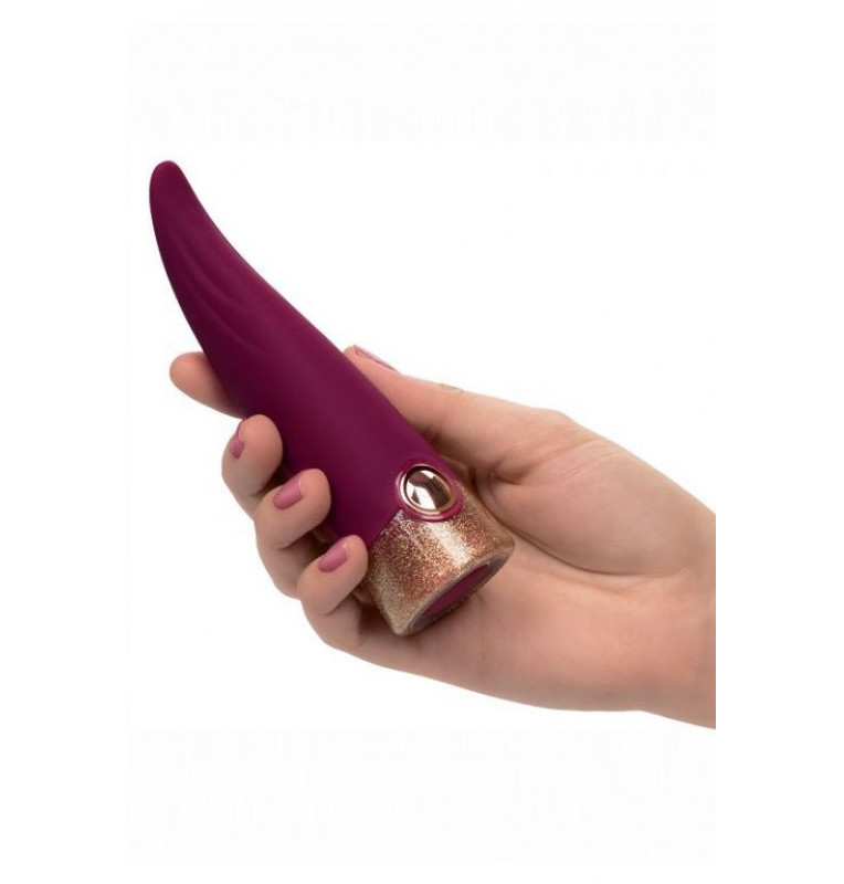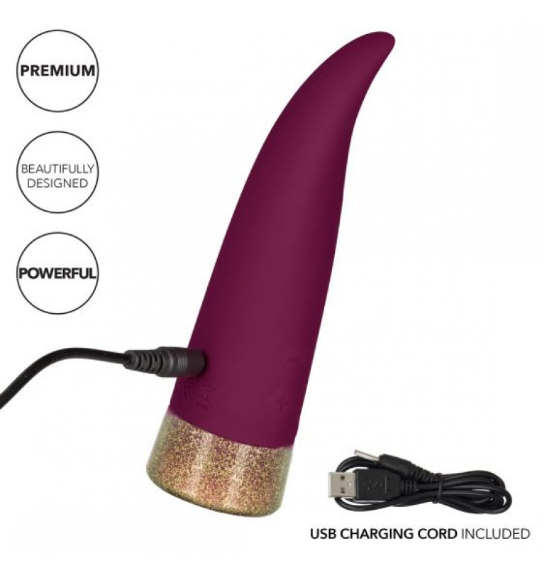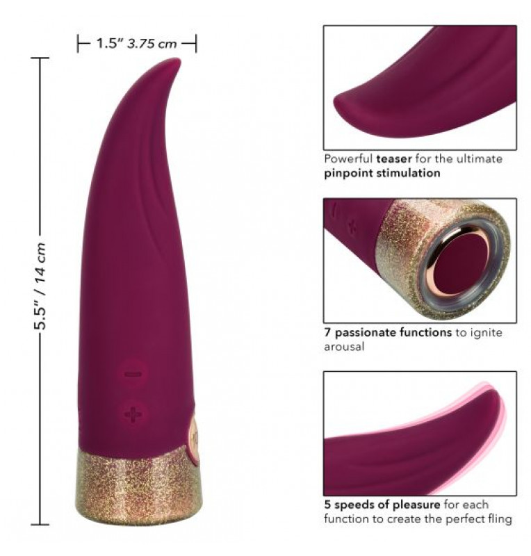 Starstruck Fling – неповторимый, бесшумный вибромассажер с невероятными 7 функциями пульсации, вибрации и эскалации и 5 независимыми скоростями для каждой функции. Интересная изогнутая форма игрушки позволит получить как клиторальное, так и вагинальное удовольствие, а изысканная упаковка удовлетворит требования даже самого бескомпромиссного критика. Вибромассажер изготовлен из гипоаллергенного мягкого силикона премиум-класса безопасного для тела, не содержащего фталатов, обеспечивающего приятные и гарантировано безопасные тактильные ощущения. Стильная упаковка игрушки идеально подойдёт для подарка любимому человеку. Управление осуществляется с помощью одной встроенной в основание кнопки, которая отвечает за включение игрушки и переключения ее режимов и двум кнопкам сбоку игрушки для регулировки силы вибрации.Чтобы включить или выключить игрушку, необходимо нажать и в течение трех секунд удерживать кнопку питания. Доступна возможность блокировки, которая позволит предотвратить самопроизвольное включение игрушки во время путешествий. Вибромассажер заряжается через USB и может быть подключен практически в любом месте, просто подсоедините идущий в комплекте шнур к совместимому порту компьютера или USB-адаптера (приобретается отдельно), а противоположный конец к разъему у основания. Полная зарядка занимает 2 часа, ее достаточно для беспрерывной работы в течение 1 часа. Рабочая длина - 9 см.