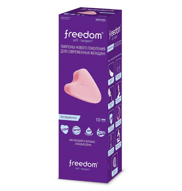 FREEDOM® - тампоны нового поколения для современных женщин! • удобная форма в виде сердечка • специальный воздушный материал • легкость введения и извлечения • легко адаптируются под форму тела • не ощущаются внутри • одобрены гинекологами и протестированы дерматологами • подходят для средних и обильных выделений • произведены в Германии Тампоны FREEDOM® обеспечивают не только надежную защиту от выделений в критические дни, но и дают возможность не отказываться от своих обычных увлечений и планов! Заниматься любовью, спортом, плавать в бассейне, танцевать, встречаться с друзьями в СПА или отдыхать на пляже – с FREEDOM® все это возможно даже в критические дни! Подробная инструкция в каждой упаковке!