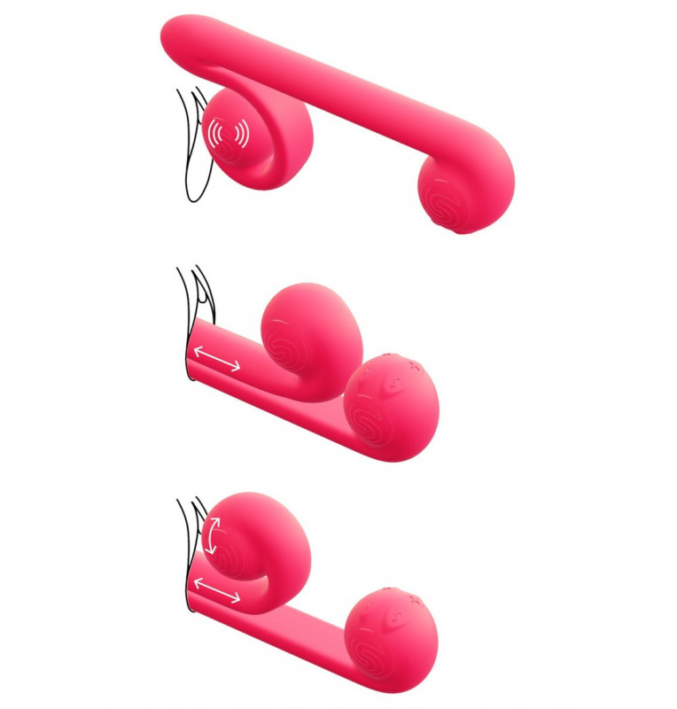 Вибромассажер Snail Vibes – универсальный, мультискоростной, инновационный аккумуляторный вибратор для одновременной двойной стимуляции из гипоаллергенного материала. Главным преимуществом стимулятора является возможность беспрерывной клиторальной стимуляции при одновременном поступательном вагинальном воздействии. Особенностью этого стимулятора является возможность смещать клиторальный отросток вдоль всей длины вагинальной части. Snail по праву можно назвать «первым вибратором по-настоящему двойного действия». Snail разработан с учетом анатомических особенностей. Два мощных мотора с отдельным управлением имеют 5 режимов вибрации и 5 скоростей для каждого из них, что обеспечивает более 600 комбинаций стимуляции. Клиторальный отросток Snail Vibes может достигать настолько интенсивной вибрации, как легендарный Magic Wand. Стержень вибратора подходит как для коротких, так и для глубоких толчков, удовлетворяя индивидуальные предпочтения каждого, в то время как стимулятор клитора имеет более широкую область воздействия, чем традиционные игрушки-кролики. Snail обеспечивает постоянный контакт вибратора и клитора во время использования игрушки. Управление осуществляется с помощью четырех встроенных в основание кнопок. Чтобы включить или выключить один из отростков, необходимо нажать и в течение трех секунд удерживать отвечающую за него кнопку с изображением волны. Вибромассажер заряжается через USB (шнур в комплекте). Время зарядки - 2 часа. Время работы - 1 час. Длина верхнего отростка - 19 см.