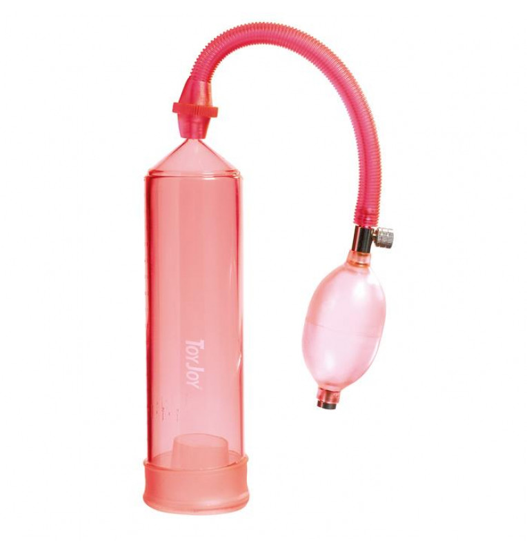 Помпа для мужчин красногоо цвета. Снабжена удобной ручкой-грушей для откачки воздуха и создания вакуума. Копка сброса давления удобно расположена рядом с грушей. На поверхности колбы нанесена шкала делений в см. Эластичный уплотнитель помогает увеличить поверхность соприкосновение помпы с кожей.