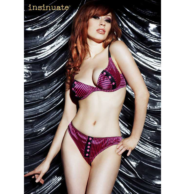 Бюстгальтер на косточках. Застежка на чашках выполнена из металлических кнопок. Бретели регулируются по длине.