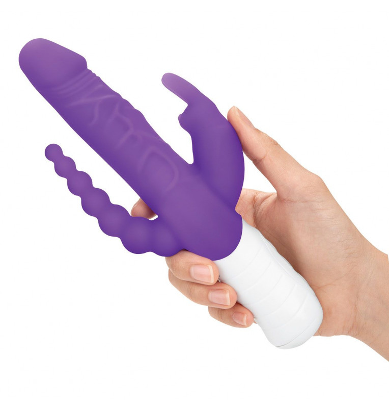 Фиолетовый перезаряжаемый вибратор с 2 дополнительными отростками - 22 см.