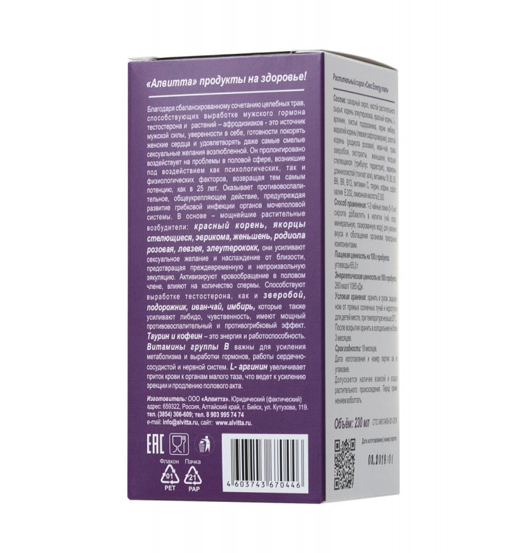 «Секс energy man» - 100% потенция, источник мужской силы, уверенности в себе, готовности покорять женские сердца и удовлетворять даже самые смелые сексуальные желания возлюбленной. Это необыкновенно мощное по своему воздействию средство для нормализации потенции. Оно способствует нормализации работы мужского достоинства при нарушении эрекции (единичном или хроническом), снижении либидо, отсутствии чувства удовлетворения при половой близости, а также при непроизвольной и преждевременной эякуляции. Благодаря сбалансированному сочетанию целебных трав, способствующих выработке мужского гормона тестостерона и растений - афродизиаков пролонгировано воздействует на источники проблем в половой сфере, возникшие под воздействием как психологических, так и физиологических факторов.