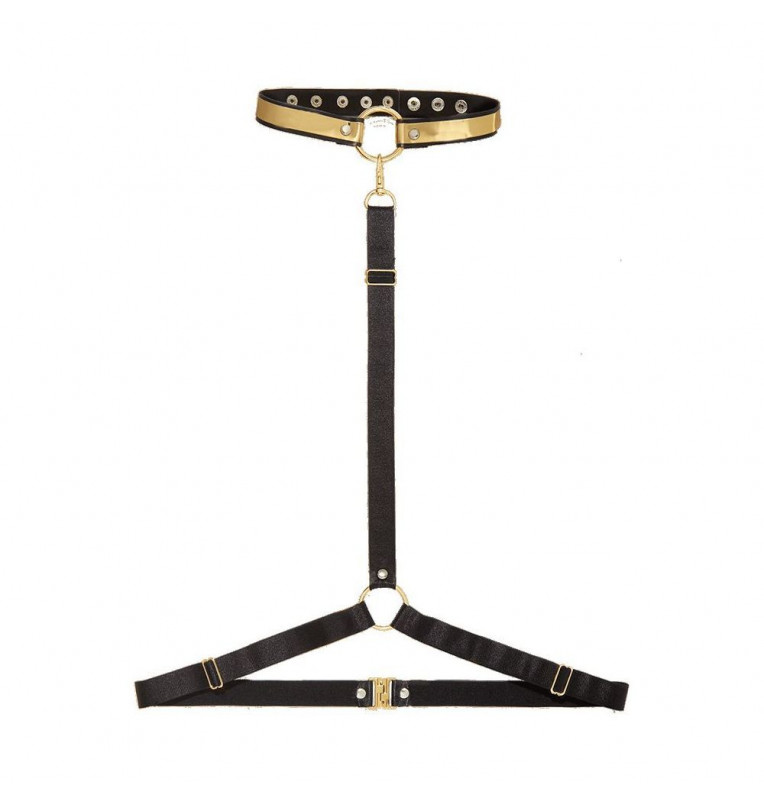 Прогрессивный американский бренд Unbound предлагает своим клиентам широкую линейку секс-игрушек и аксессуаров для незабываемых эротических игр. Стильная сексуальная портупея Unbound Harness станет самым ярким атрибутом интимного образа и поможет быстро довести партнера до пика эротического возбуждения. Портупея состоит из золотистого лакированного ошейника, который соединен с ремешками, обхватывающими грудь и талию. Мягкие и эластичные ремни на обнаженном теле выглядят дерзко и сексуально, погружая партнеров в захватывающий мир БДСМ-практик. Этот оригинальный аксессуар можно также использовать в качестве украшения, сочетая с различными предметами женского гардероба.