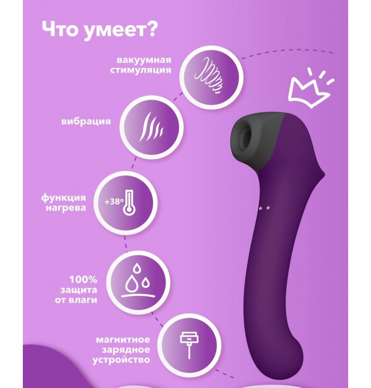 Игрушка-ХИТ для любительниц оральных ласк! Сатисфакер Caldo - вакуумный стимулятор, который можно использовать еще и в качестве вибратора. Функциональность. У вибратора 5 сосательных функций и 8 вариантов вибрации. Вам будет из чего выбрать. А ещё он приятно нагревается до 38 градусов. Это очень возбуждает, делает все ощущения острее. Внешний вид. Эта модель мало похожа на интимную игрушку. У неё яркий цвет и интересный дизайн. Материал. Стимулятор сделан из безопасного гипоаллергенного силикона премиум класса. Он не вызывает раздражения, очень приятен на ощупь и прост в уходе. Водонепроницаемость уровня IPX7. Это значит, что игрушку можно погружать на глубину до 1 метра на полчаса и смело использовать под душем. Бесшумность. Сатисфакер практически бесшумный, не громче работающего системника. Вы, получающая от него удовольствие, будете шуметь намного больше. Зарядка. Заряжается игрушка с помощью магнитной зарядки от любого устройства, имеющего USB вход. 1.5 часа заряжаете - 2 часа получаете оргазмы. Гарантия. Производитель гарантирует, что на протяжении 3 лет игрушка будет работать как часики. Сатисфакер Caldo станет приятным подарком для любой девушки!