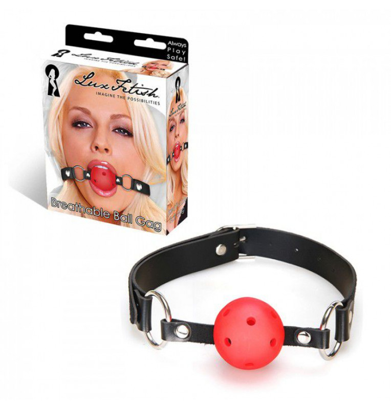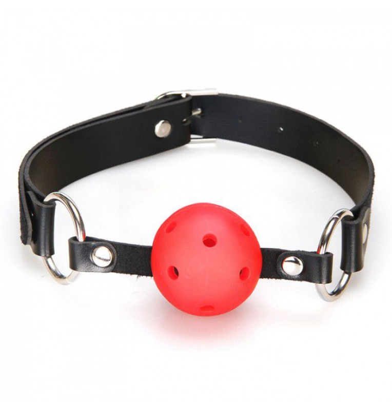 Кляп в виде пластикового шарика с отверстиями, которые позволяют дышать через рот во время фетиш-игр. Кляп фиксируется с помощью ремешка из искусственной кожи с металлическими элементами как кольца и кнопки, придающими дополнительную прочность и особый дизайн изделию. Ремешок регулирует длину обхвата кляпа от 42 до 60 см.
