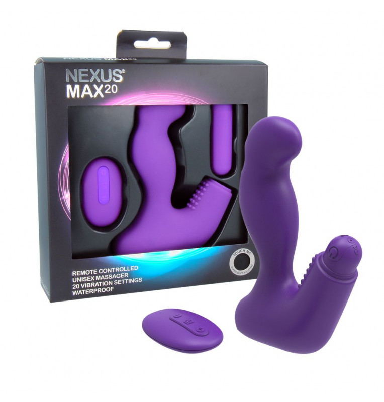 Фиолетовый вибромассажёр простаты NEXUS MAX 20 выполнен из гипоаллергенного силикона. В комплекте идёт съемная перезаряжаемая водонепроницаемая вибропуля с 20 режимами вибрации, управлять которой можно при помощи дистанционного пульта. Рабочая длина - 10 см.