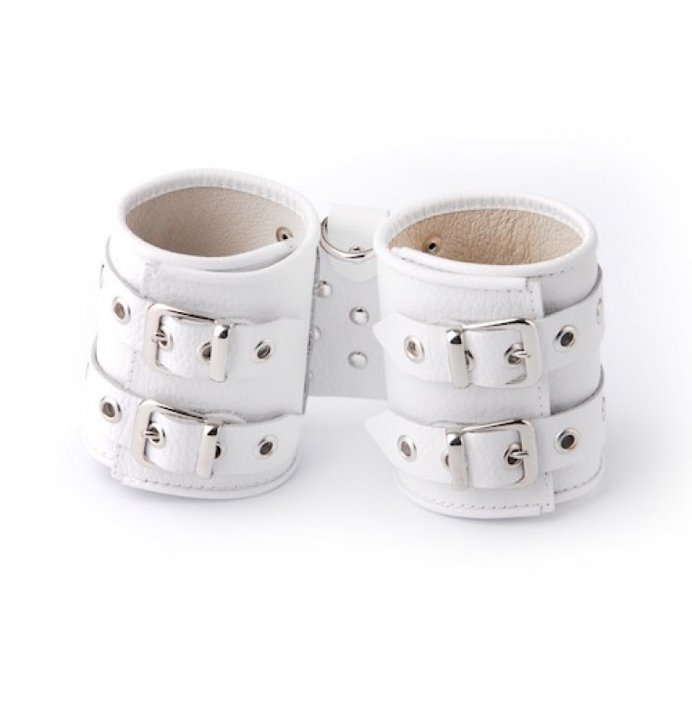 Изготавливаются из натуральной кожи с велюровой подкладкой. При изготовлении использована фурнитура с никелевым покрытием. Между собой имею неразъёмное соединение. Не нарушают кровообращение, надёжно фиксируют запястья. Расстегнуть самостоятельно практически невозможно. Размер универсальный.