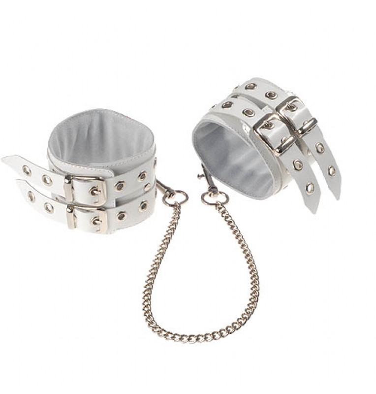 Изготавливаются из натуральной кожи с велюровой подкладой. При изготовлении использована фурнитура с никелевым покрытием. Между слоем основы и подкладой проложена мягкая прокладка. Соединяются между собой цепочкой с двумя карабинами на концах. Не нарушают кровообращение, надёжно фиксируются на щиколотках с помощью двух ремешков. Размер универсальный. Длина цепочки - 35 см.