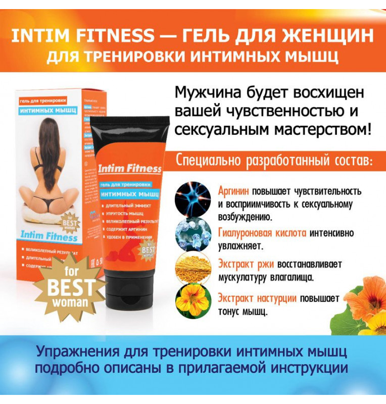 Интимный гель Intim Fitness – верный помощник каждой женщины, решившей укрепить вагинальные мышцы. Увлажняющее, питательное и тонизирующее средство помогает повысить упругость вагины, сделать её более тугой. Используя гель и выполняя комплекс специальных упражнений (описание прилагается), вы сможете научиться владеть интимными мышцами в совершенстве! Гиалуроновая кислота – интенсивно увлажняет слизистые половых органов. Аргинин – повышает чувствительность и восприимчивость к сексуальному возбуждению. Экстракт ржи – восстанавливает мускулатуру влагалища, делает его упругим. Экстракт настурции – облегчает транспорт кислорода в клетки, активизирует обменные процессы и повышает тонус мыщц.