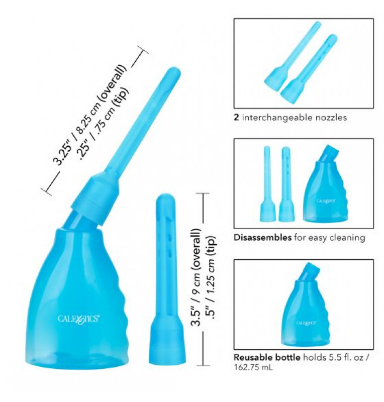 Ultimate Douche - мощная многоразовая очистительная система для интимной гигиены. Она включает в себя два варианта насадок. Гладкий тонкий наконечник обеспечивает легкое проникновение и комфортную очистку. Многонаправленный наконечник обеспечивает яркую стимуляцию и более глубокое промывание. Перед использованием специализированная бутылка заполняется теплой водой. Выберете один из двух наконечников, прикрутите к резервуару и осторожно введите внутрь. Для комфортности введения и получения максимально приятных ощущений рекомендуем использовать смазку на водной или силиконовой основе. Затем медленно сожмите бутылку, чтобы опустошить резервуар. Длина тонкого наконечника - 8,25 см., диаметр - 0,75 см. Длина толстого наконечника - 9 см., диаметр - 1,25 см.