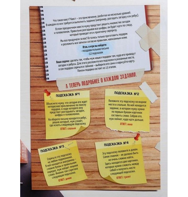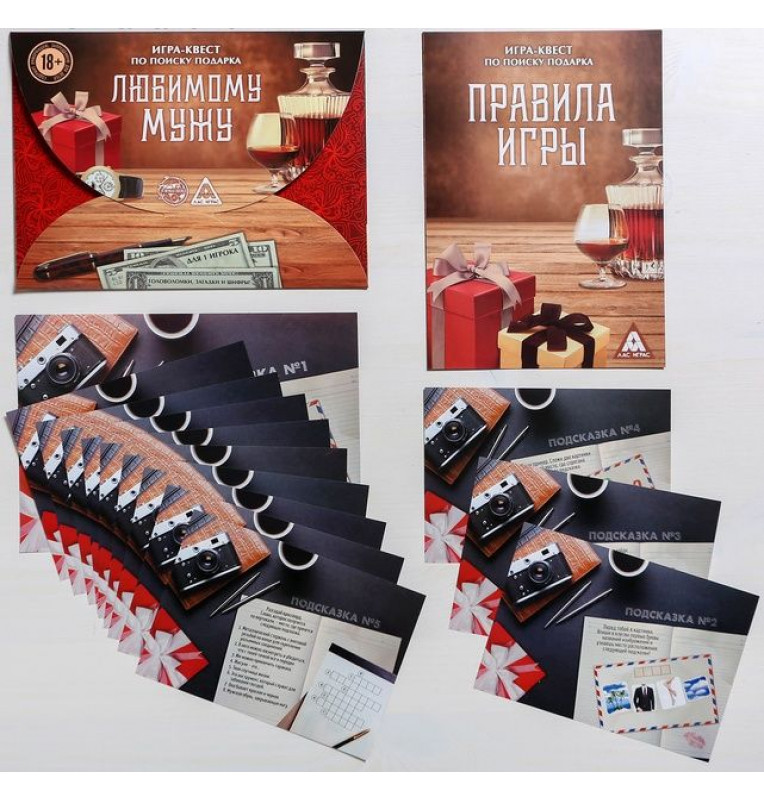 Скоро день рождения мужа и хочется, чтобы он прошёл ярко и незабываемо? Тогда представьте: вы вручаете письмо, а в нём… задания, шифры и головоломки, которые приведут к сюрпризу. Такое поздравление запомнится надолго! Что нужно делать? Виновнику торжества предстоит справиться со множеством головоломок. Правильно разгадывая шифры, он будет идти по следу, который приведёт к приятному сюрпризу. Всё, что нужно - это правильно расположить все подсказки: под подушкой, в карманах одежды, под стулом и в других местах вашей квартиры. Следуйте правилам, и тогда у вас всё получится! В комплекте: праздничное письмо, 12 подсказок, правила.