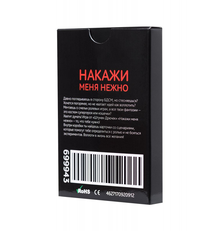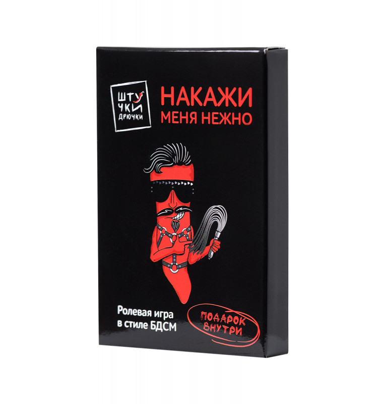 Мини-версия игры «Накажи меня нежно» — то, что нужно, если ты давно поглядываешь в сторону БДСМ, но стесняешься. Если хочется добавить огня в секс, но не хватает идей, а все твои фантазии сводятся к костюму супергероя или кошечки. Внутри коробки ты найдешь карточки со сценариями, которые помогут тебе определиться с ролью и не бояться экспериментов, а также тебя ждет небольшой подарок. В комплекте: карточки, эрекционное кольцо.