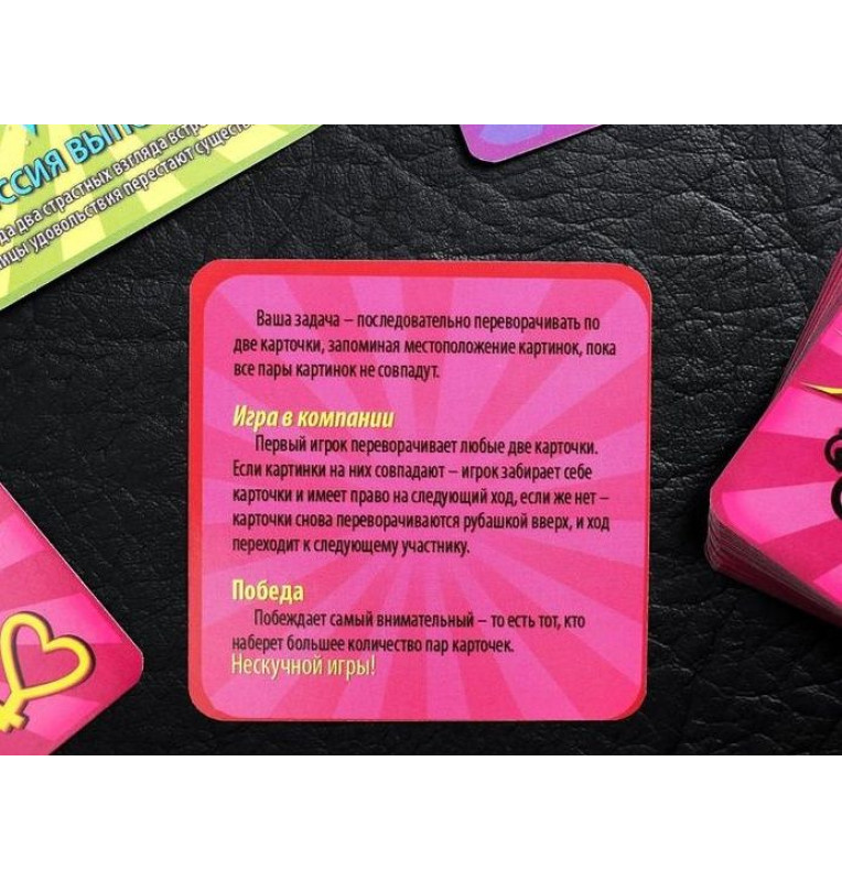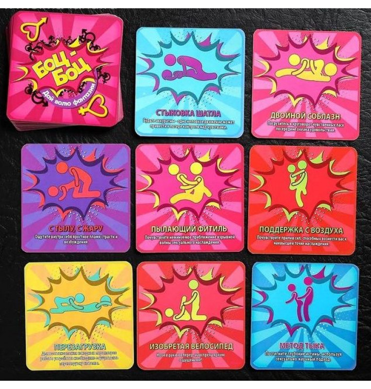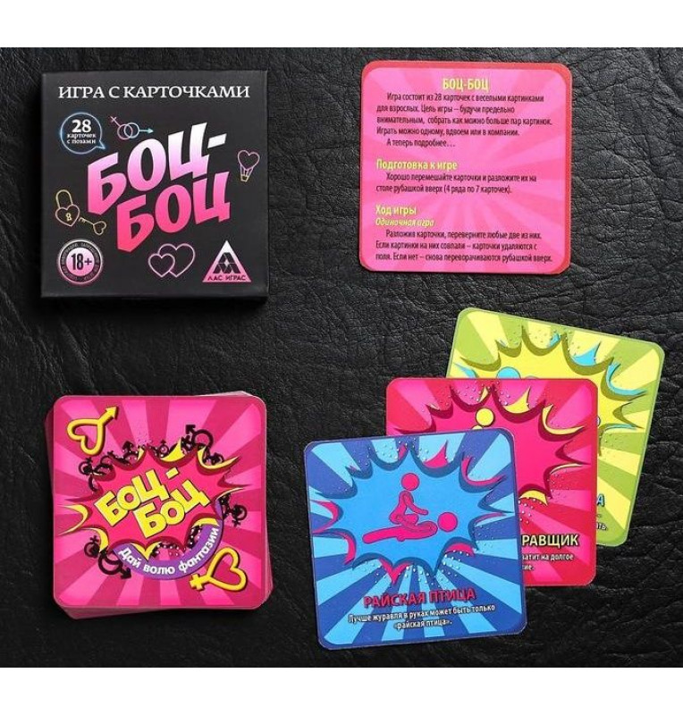 Веселая эротическая игра «Боц-боц» никого не оставит равнодушным. Играть в нее можно в одиночку или в компании, но лучше всего вдвоем, ведь картинки на сексуальную тему помогут двум влюбленным раскрепоститься или внести разнообразие в семейную жизнь. Итак, садитесь поудобнее, настраивайтесь на позитив и начинайте играть! Шаг 1.Разложите карточки в четыре ряда рубашками вверх. Шаг 2.По очереди тяните по две карточки, одну за другой. Если они совпали – забираете себе, нет – кладете обратно. Шаг 3.Когда все карточки закончатся, подсчитайте их количество у каждого игрока. У кого больше, тот и победитель! Чтобы выиграть, нужна не только удача, но и внимательность: запоминая местоположение карточек, вам будет легче вытянуть одинаковые. Игра помогает тренировать память, расширяет границы фантазии и дарит положительные эмоции!