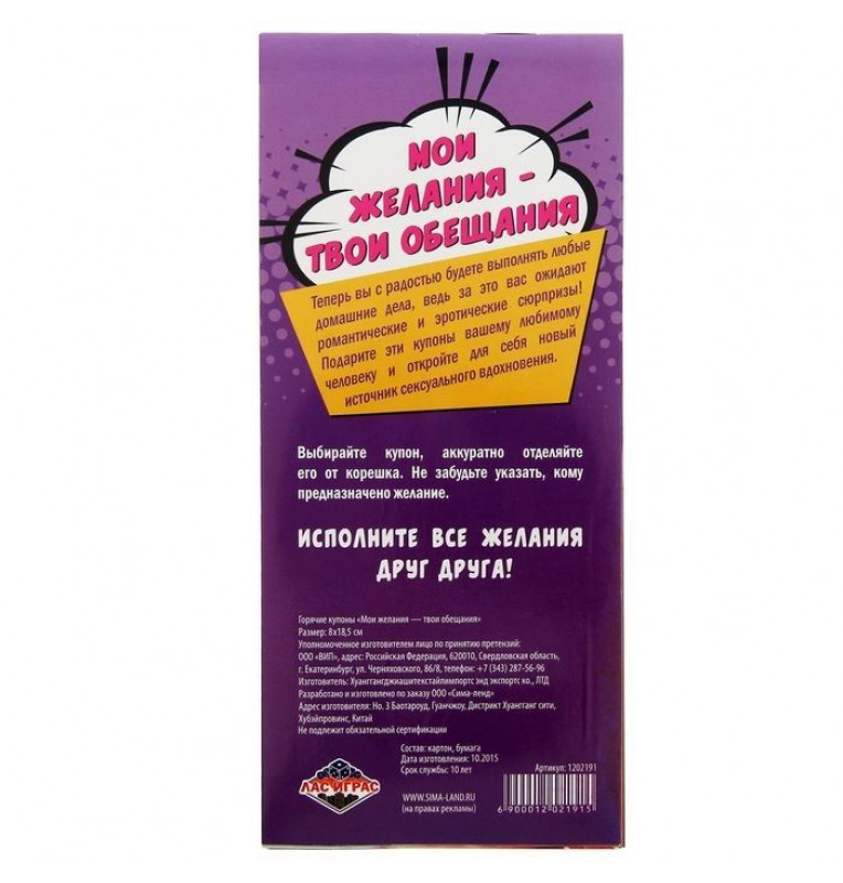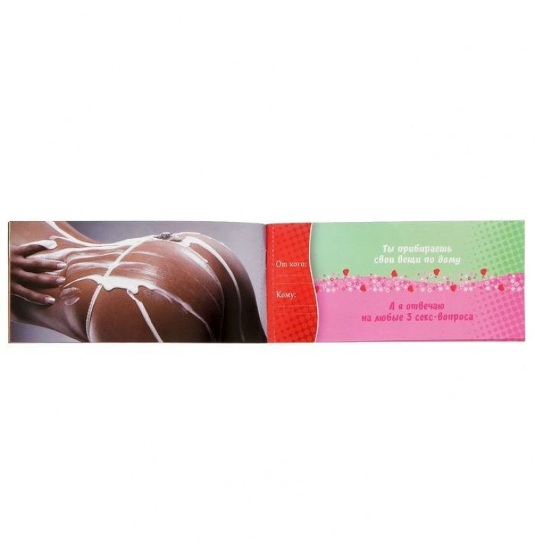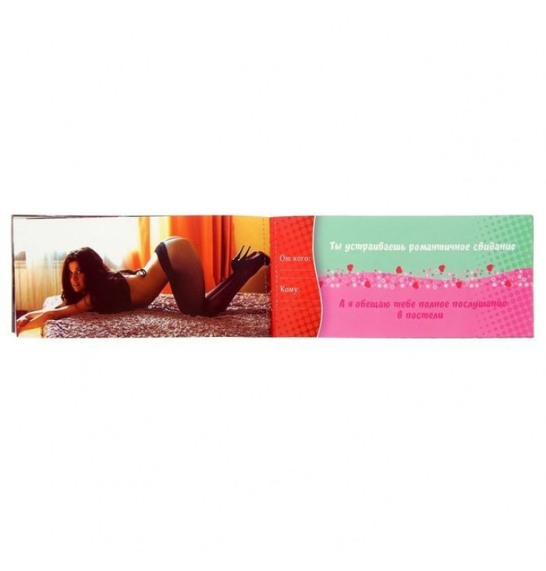 Теперь все домашние дела будут в радость! Ведь после вас ожидает романтическое и эротическое вознаграждение! Дарите горячие купоны, и вы найдёте новый источник сексуального вдохновения. Исполните все желания второй половинки! В наборе вы найдёте купоны для неё и для него. Выбирайте желание на любой вкус и дарите неземное наслаждение друг другу! В набор входят 20 купонов.