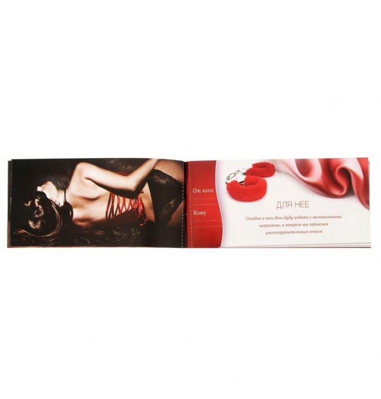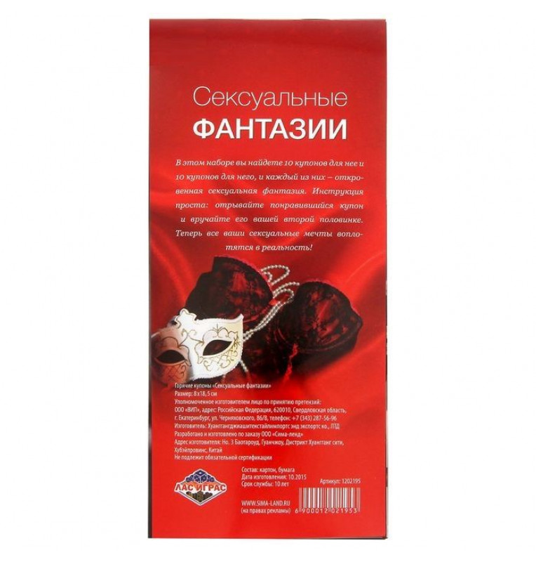 Хотите узнать самые пикантные мечты вашей половинки? Горячие купоны «Сексуальные фантазии» не только расскажут о них, но и помогут воплотить в жизнь всё, что вы когда-то задумывали. В наборе вы найдёте 10 купонов для неё и 10 купонов для него. Каждый из них откроет откровенные и смелые сексуальные фантазии. В набор входят 20 купонов.