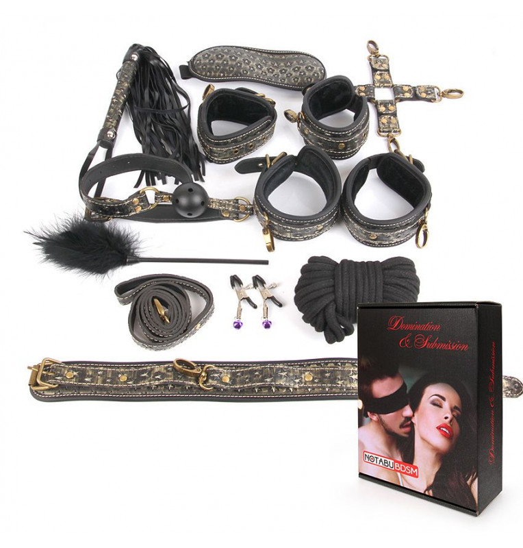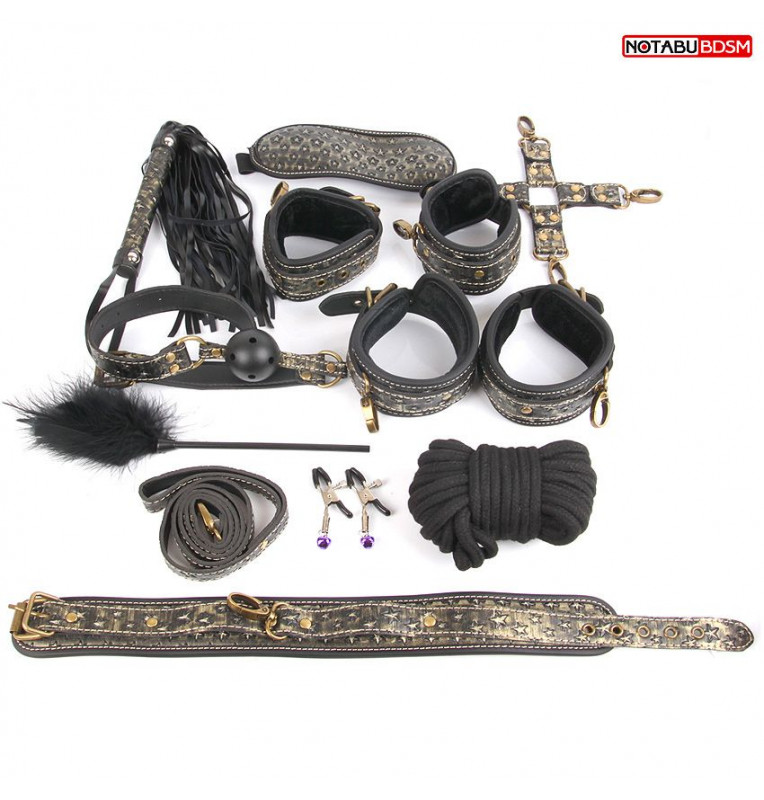 Великолепный набор аксессуаров для любителей БДСМ. В комплект входят наручники, оковы, ошейник с поводком, веревка, фиксатор, плетка, кляп, маска, зажимы для сосков, щекоталка. Кляп, наручники, оковы, ошейник и маска снабжены специальной внутренней накладкой, предотвращающей натирание кожи. Также изделия имеют возможность регулирования размера. Плеть-флоггер состоит из хвостов и удобной рукоятки с петлей. Зажимы для сосков имеют эластичные накладки, которые препятствуют сильному сдавливанию сосков. На каждом изделии предусмотрен регулировочный винт, позволяющий контролировать силу сдавливания сосков. Подвески дают небольшой эффект утяжеления и украшают зажимы.Удобный кляп оснащен шариком с отверстиями для дыхания. Щекоталка состоит из тонкой ручки и густого пушка. БДСМ аксессуары выполнены в черно-золотой цветовой гамме и украшены звездами. В комплекте: наручники, оковы, ошейник с поводком, верёвка, фиксатор, плётка, кляп, маска, зажимы для сосков, щекоталка.