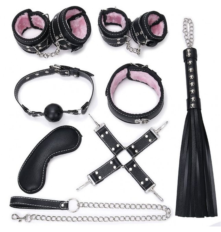 Пикантный черно-розовый набор БДСМ: маска, ошейник, кляп, фиксатор, наручники, оковы, плеть