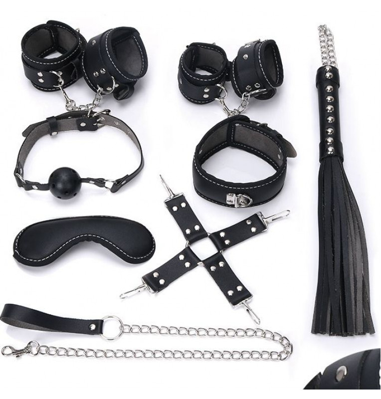 Великолепный набор аксессуаров для любителей БДСМ. В комплект входят наручники, оковы, ошейник с цепочкой-поводком, фиксатор, плетка, кляп, маска. Кляп, наручники, оковы, ошейник и маска снабжены специальной внутренней накладкой, предотвращающей натирание кожи. Также изделия имеют возможность регулирования размера. Плеть-флоггер состоит из хвостов и удобной рукоятки с металлическими вставками и петлей для подвешивания на крючок. Кляп оснащен шариком с отверстиями для дыхания.