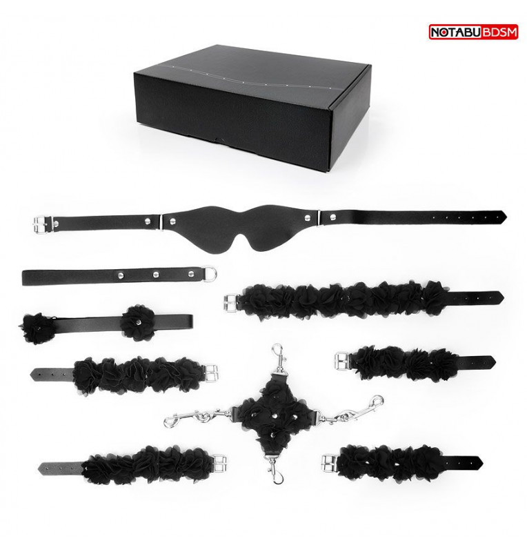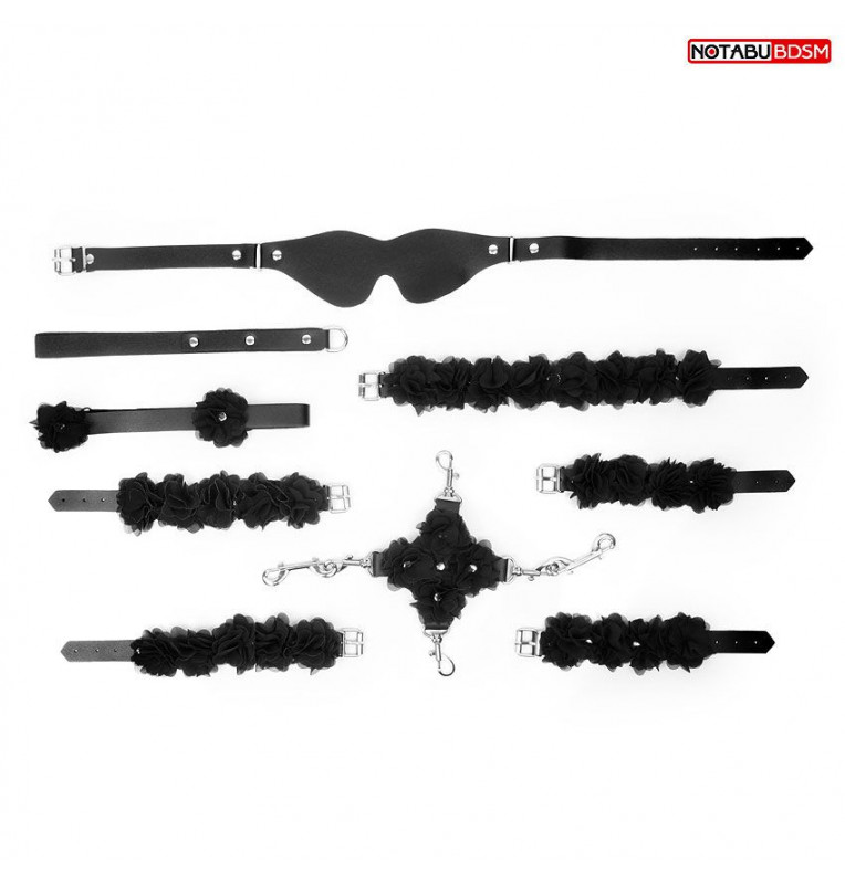 Великолепный набор аксессуаров для любителей БДСМ-игр. В комплект входят маска, фиксатор, ошейник с поводком, наручники, оковы, шлёпалка. Наручники, оковы, ошейник и маску можно регулировать по размеру. Изделия украшены декоративными цветами и оснащены качественной фурнитурой. В набор входит специальная сумка с ручкой-цепочкой для хранения интимных аксессуаров и презентабельная упаковочная коробка. В комплекте: маска, фиксатор, ошейник с поводком, наручники, оковы, шлёпалка. Длина шлепалки - 25 см.