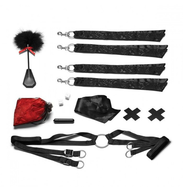 Приготовьтесь к романтической ночи с этим набором, среди которых есть все аксессуары, необходимые для чувственной близости с вашим партнером или группой. Атласные манжеты, лепестки роз, нежная повязка на глаза, перья для порки, ласки и щекотки, а также вибропуля и кубики для игры. Бросьте кости для возникновения идей прелюдии, пока вы исследуете фиксацию. Шелковистые лепестки роз идеально подходят для создания приятной обстановки. С таким большим количеством изящных аксессуаров на выбор у вас и ваших партнеров - скуке не место! В комплекте: 4 манжеты, лепестки роз, повязка на глаза, щекоталка, вибропуля, пэстисы, лента, кубики для игры, фиксация.