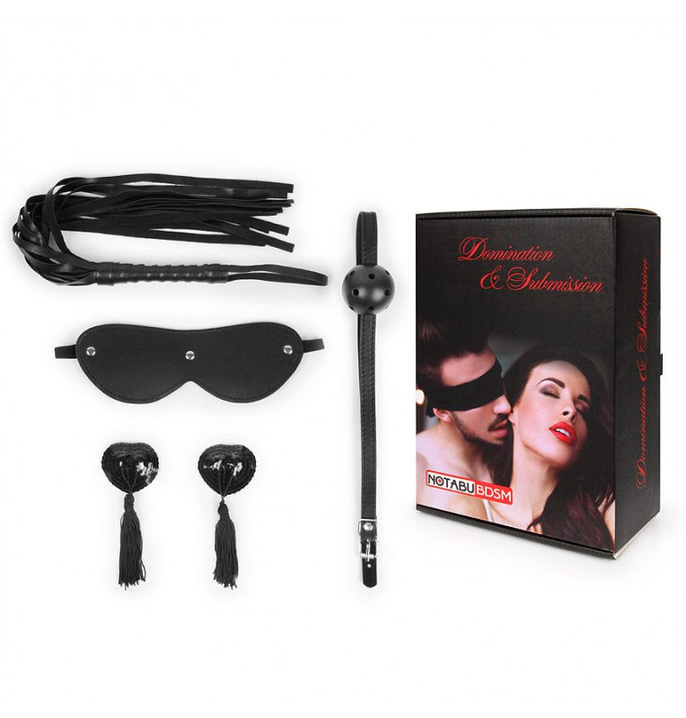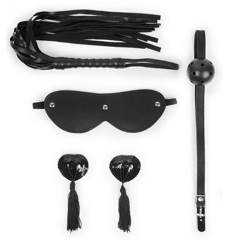 Великолепный набор аксессуаров для любителей БДСМ-игр. В комплект входят плеть, кляп, маска и пэстисы для украшения сосков. Плеть-флогер состоит из длинных хвостов и удобной рукоятки с петлёй для наматывания на руку или подвешивания на крючок. Кляп оснащён шариком с отверстиями для дыхания.