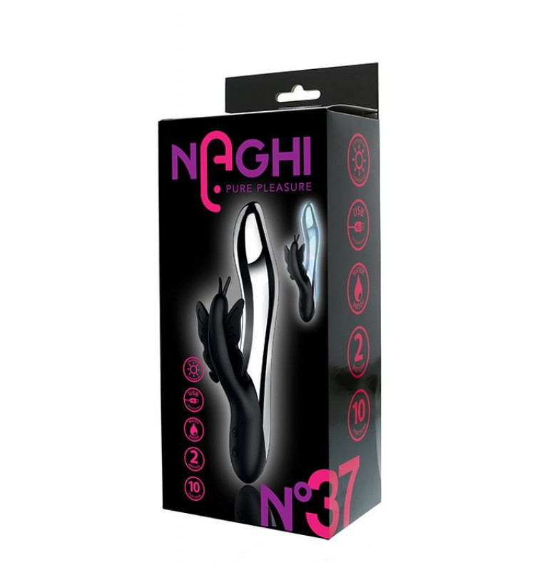Черный вибратор с подсветкой NAGHI NO.37 RECHARGEABLE LIGHT-UP VIBE. Вибратор с клиторальным стимулятором, перезаряжаемый, светящийся, имеет 2 мотора и 10 режимов вибрации, влагозащитный корпус. Рабочая длина - 12 см.