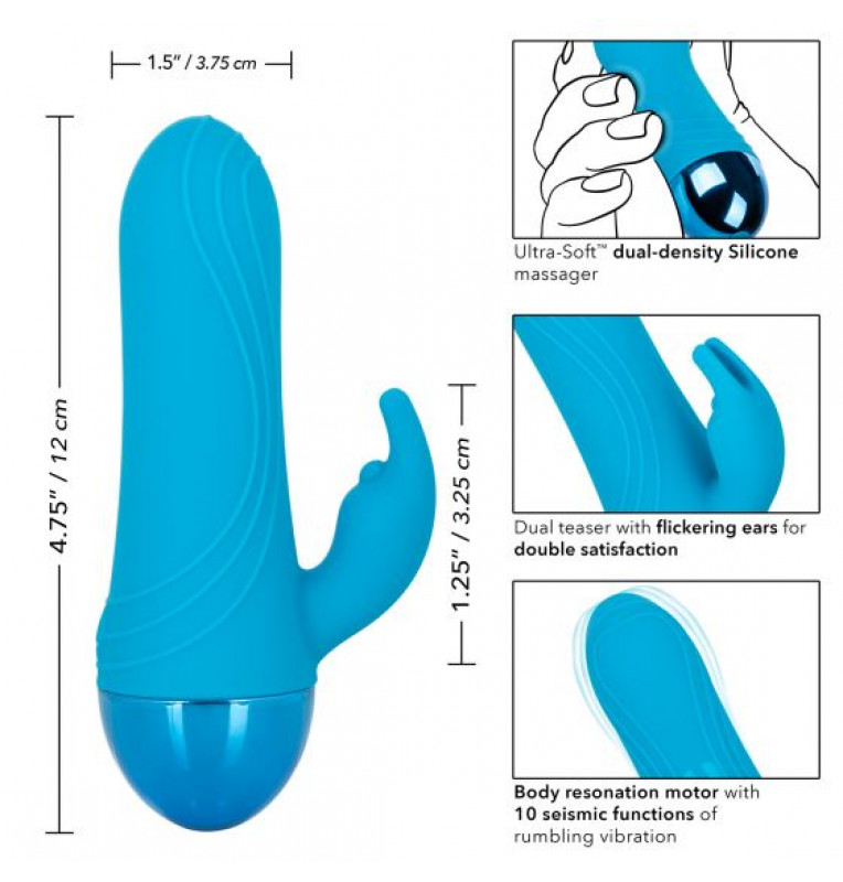Tremble Please - это универсальный мини-вибратор кролик с мощным моторчиком и двойным силиконом Ultra-Soft. Имеет 10 функций вибрации, подходит для стимулирования любых эрогенных зон, а ушки кролика сделают стимуляцию более обширной и результативной. Компактный размер дает возможность взять игрушку в поездку. Управление осуществляется с помощью одной встроенной в основание кнопки. Чтобы включить или выключить игрушку, необходимо нажать и в течение трех секунд удерживать кнопку питания. Вибромассажер заряжается через USB и может быть подключен практически в любом месте, просто подсоедините идущий в комплекте шнур к совместимому порту компьютера или USB-адаптера (приобретается отдельно), а противоположный конец к разъему у основания. Полная зарядка занимает 1,5 часа, ее достаточно для беспрерывной работы в течение 70 минут. Рабочая длина - 7,5 см.