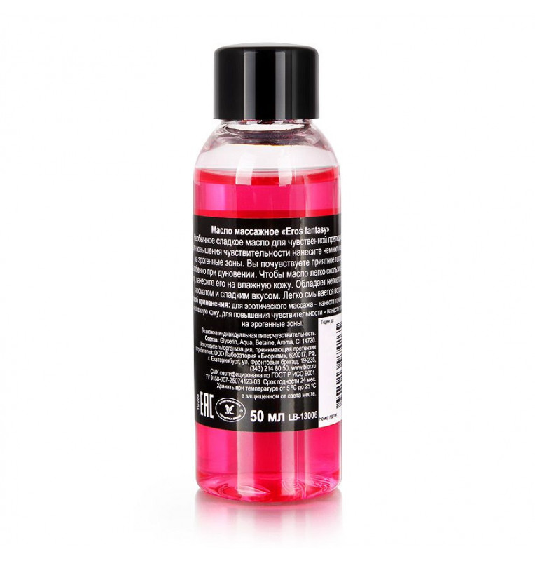 Масло массажное «Eros Fantasy» для эротического массажа. Вызывает ощущение тепла, особенно при дуновении. Повышает чувствительность. Имеет приятный аромат земляники и сладкий вкус. Обеспечивает длительное скольжение. Легко смывается водой.