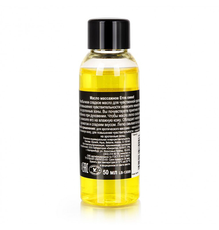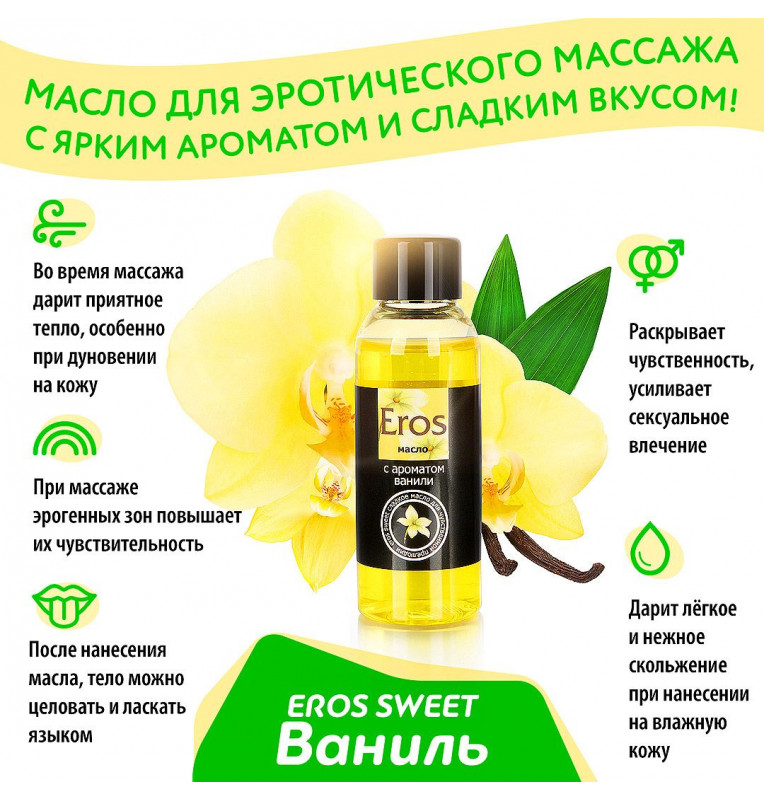 Масло массажное «Eros Sweet» для эротического массажа. Вызывает ощущение тепла, особенно при дуновении. Повышает чувствительность. Имеет приятный аромат ванили. Обеспечивает длительное скольжение. Легко смывается водой.
