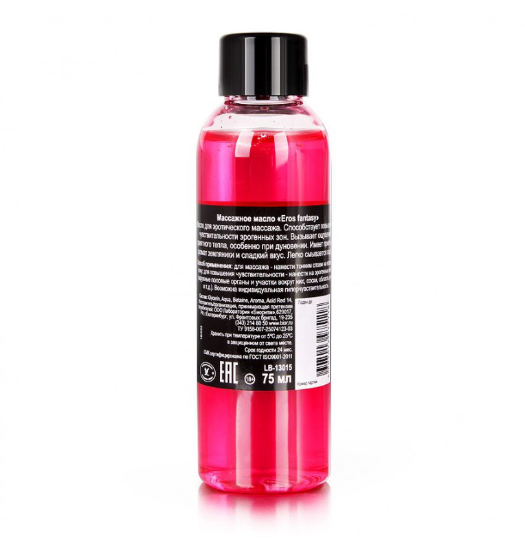 Масло массажное «Eros Fantasy» для эротического массажа. Вызывает ощущение тепла, особенно при дуновении. Повышает чувствительность. Имеет приятный аромат земляники и сладкий вкус. Обеспечивает длительное скольжение. Легко смывается водой..