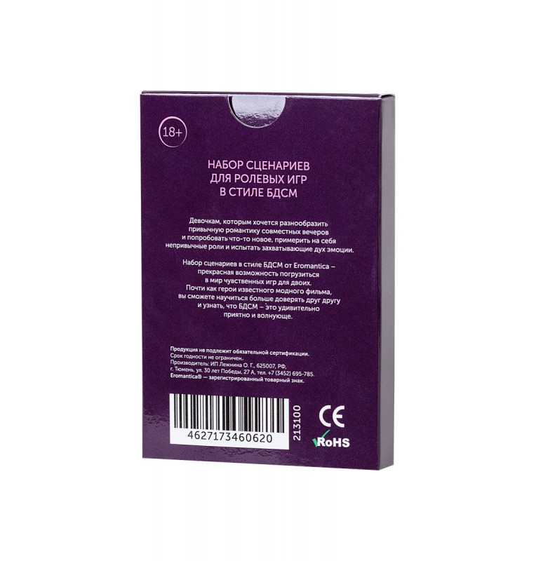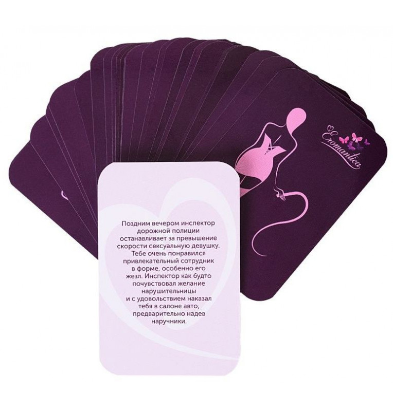 Всем девочкам иногда хочется разнообразить привычную романтику совместных вечеров и попробовать что-то новое… Примерь на себя непривычные роли, проигрывая с партнером сценарии от Eromantica. Если ты из тех, кто любит погорячее, - испытай захватывающие дух эмоции от чувственных игр. Пробуди в партнере интерес к смелым экспериментам. Осталось только определиться со сценарием…