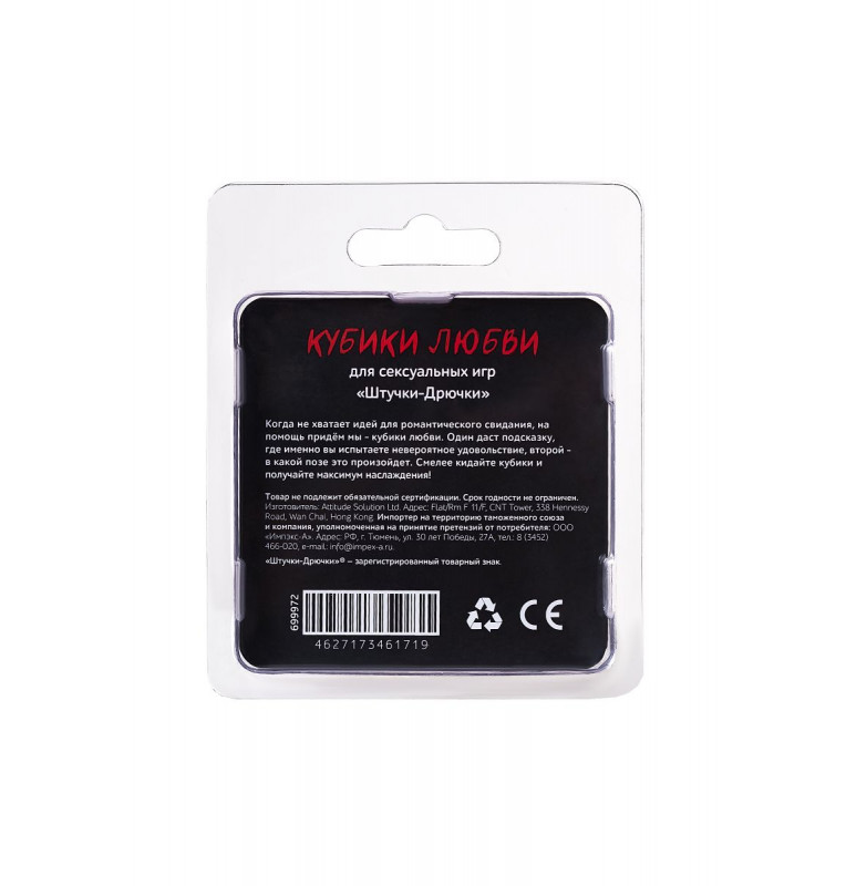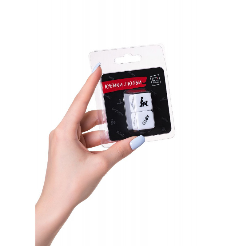 Когда не хватает идей для романтического свидания, на помощь придут Кубики любви от бренда Штучки-Дрючки. Один даст подсказку, где именно вы испытаете невероятное удовольствие, второй – в какой позе это произойдет. Достаточно поддаться азарту и воле случая, чтобы разнообразить интимную жизнь! Товар будет интересен абсолютно разной аудитории: тем, кто ищет шутливый подарок на особый случай или тем, кто любит дарить пикантные сувениры без повода и просто посмеяться, а также тем покупателям, которые хотят внести разнообразие в свою интимную жизнь. 2 кубика удобно помещаются в руке, выполнены из высококачественного пластика. Доступно и непринужденно, шутя и игриво кубики от бренда Штучки-Дрючки продолжают знакомить покупателей с миром новых ярких эмоций и ощущений.