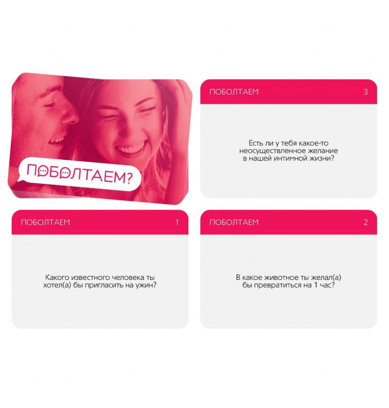 Эта игра поможет вам лучше узнать свою вторую половинку и пообщаться на темы, которые откроют близкого человека с новой стороны. Читайте вопросы по очереди, общайтесь и узнавайте друг друга! В комплекте: 25 карт.
