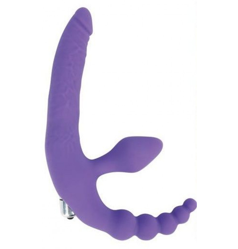Фиолетовый безремневой страпон с анальным отростком и вибрацией - 15 см.