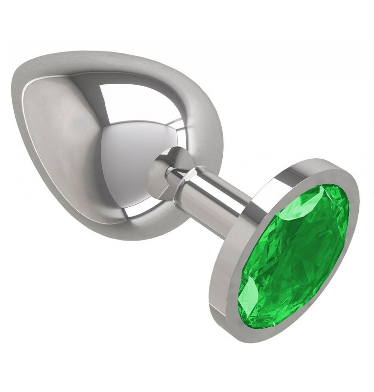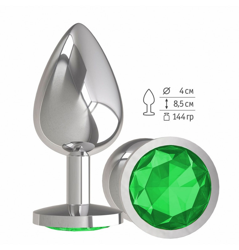 Серебристая большая анальная пробка с зеленым кристаллом - 9,5 см.
