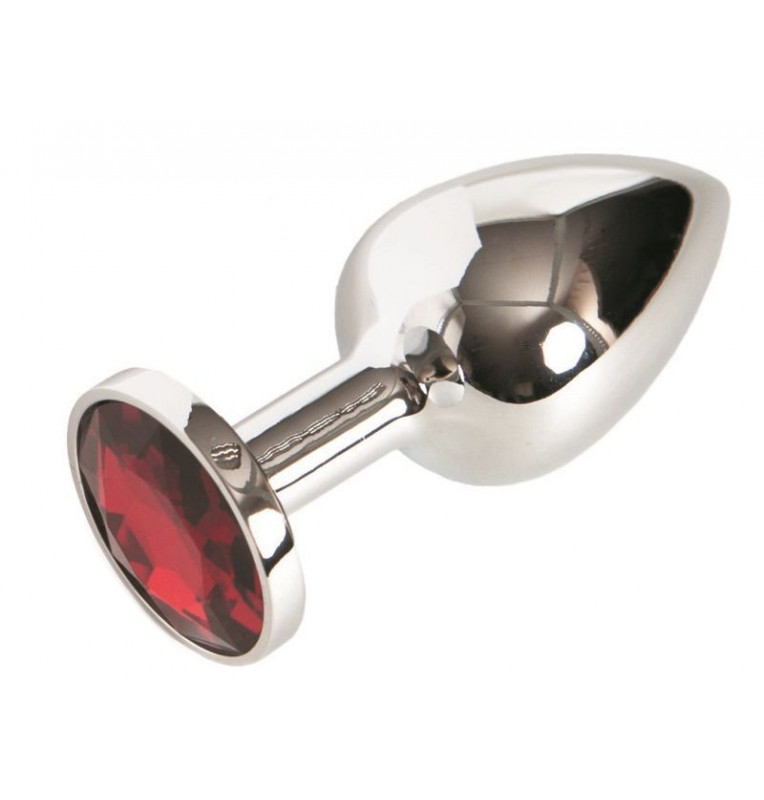 Малая серебристая анальная втулка с красным кристаллом. Поставляется в подарочной упаковке.