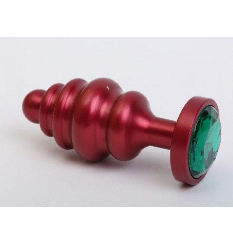 Красная ребристая анальная пробка с зеленым стразом - 7,3 см.