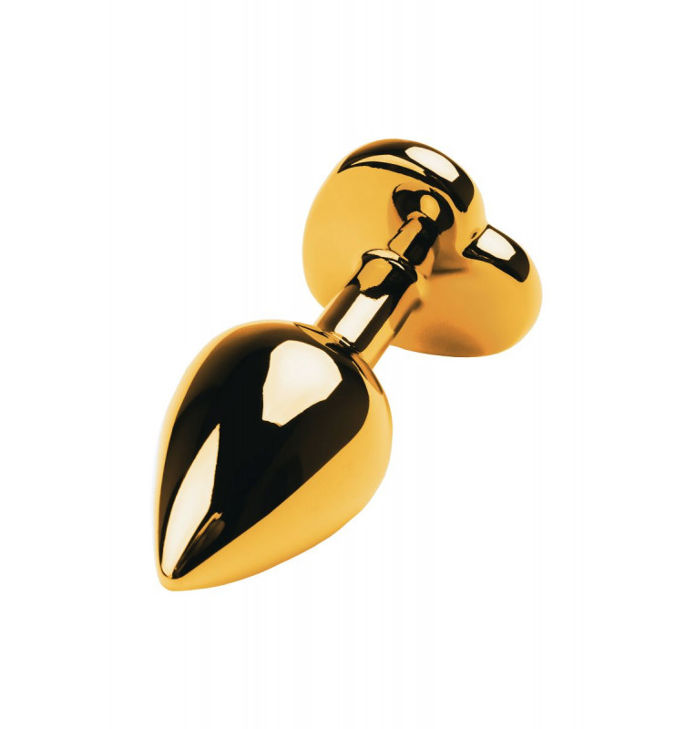 Золотистая анальная втулка из легкого сплава ощутима по форме, но комфортна по весу. Страз в форме сердечка украсит ваши игры.